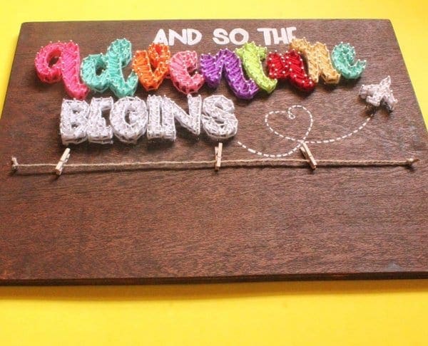This Adventure Begins String Art , simply put, involves the use of string, thread, wood and colorful wool as an art form. The brilliance of the art shines through when a delicate balance is achieved between the simplicity of the design and the intricate elaborateness of the thread configurations that form the body of the art. Another delightful characteristic of the art is the smooth flowing texture that is achieved by the spools of thread against the rugged rustic feel of the wood on which it takes form.